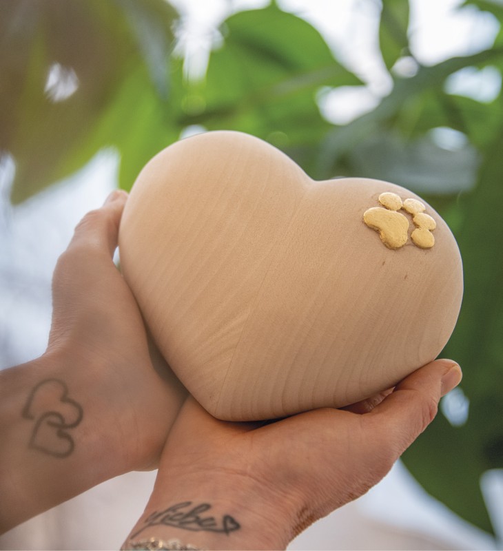 Bei uns findest du eine Vielzahl unterschiedlichster Tierurnen, denn jedes Tier ist einzigartig und besonders. Daher darf auch sein letzter irdener Ruheplatz ganz individuell und besonders sein. Neben wunderschönen biologisch abbaubaren Tierurnen bieten wir eine Vielzahl von Urnen aus unterschiedlichsten Materialien an, die allesamt vollkommen individuell gestaltet werden können. Ob mit dem Namen deines Tieres, dessen Pfotenabdruck, dessen Haaren oder sonstigem. In einem vertrauten und liebevollen Gespräch schauen wir gemeinsam, was für deinen geliebten Freund und dich passend sein könnte.